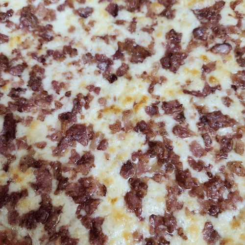Bacon Pizza: small or large size options, topped with crispy bacon strips