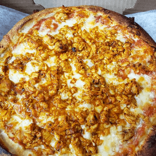 Buffalo chicken pizza: Spicy chicken, mozzarella, buffalo sauce. Options for small or large sizes