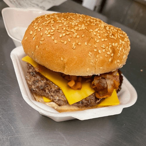 Beef patty with American cheese, typically includes lettuce, tomato, and onions, served on a bun with ketchup and mayonnaise